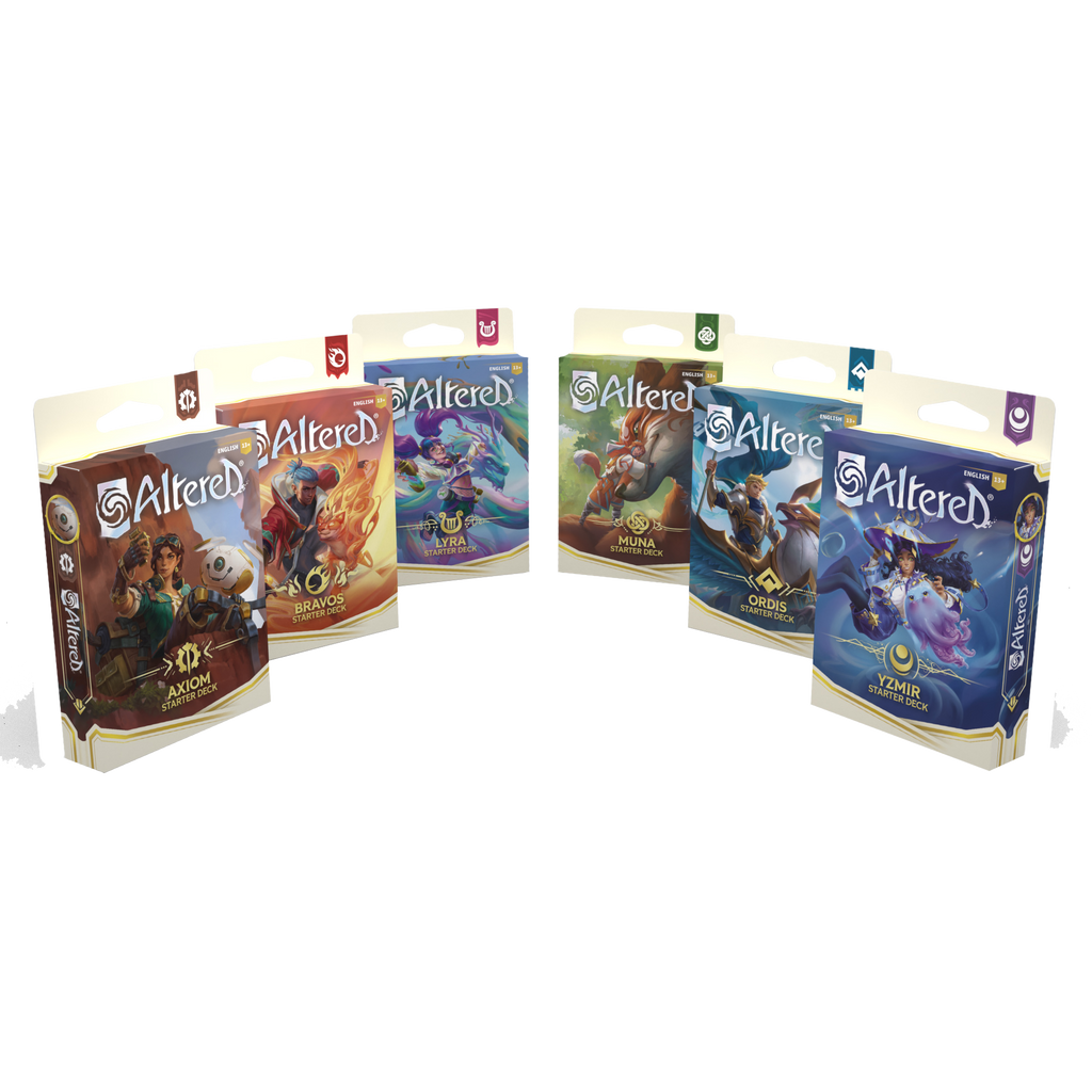 Lead your expeditions Beyond the Gates in this first core set for Altered, a brand new and innovative trading card game. As one of the Heroes of your Faction, you and your Companion have been sent to discover and bring balance to the nearby regions altered by magical winds. Reunite your Hero and your Companion anywhere on the adventure map to win the game! Play your first game and learn the rules with these Altered Starter Decks, containing everything you need to play Altered. Starter Decks are perfect for new players: shuffle your cards and you can play with them right away! They contain 40 cards (39 cards + 1 Hero), a rule leaflet, a foldable playmat with the game zones, the 5 Adventure cards 2 Reminder cards, 1 Foiler card and some markers as well! Once you feel like you know your deck, customize it with Rare and Unique cards from booster packs! Dont forget to scan your cards: adding your cards to your digital collection is needed to unlock all of the digital features Altered has to offer.