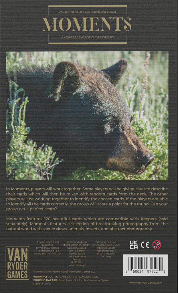 In Moments, players will work together. Some players will be giving clues to describe their cards which will then be mixed with random cards from the deck. The other players will be working together to identify the chosen cards. If the players are able to identify all the cards correctly, the group will score a point for the round. Can your group get a perfect score? Moments is a standalone expansion features 120 beautiful cards which are compatible with Keepers. Moments features a selection of breathtaking photography from the natural world with scenic views, animals, insects, and abstract photography. Ages 8+, 2 to 8 Players