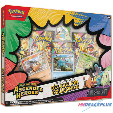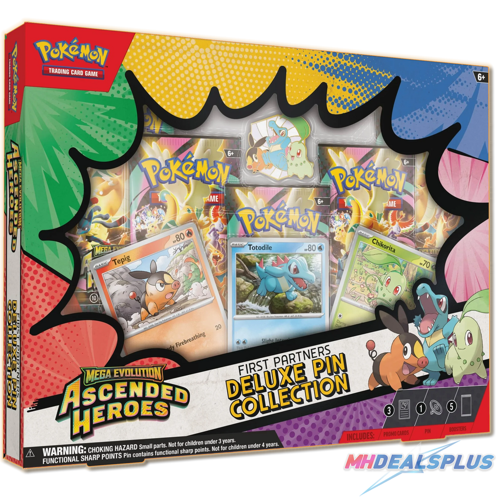 The Pokemon TCG: Pokemon Ascended Heroes First Partners Deluxe Pin Collection includes: